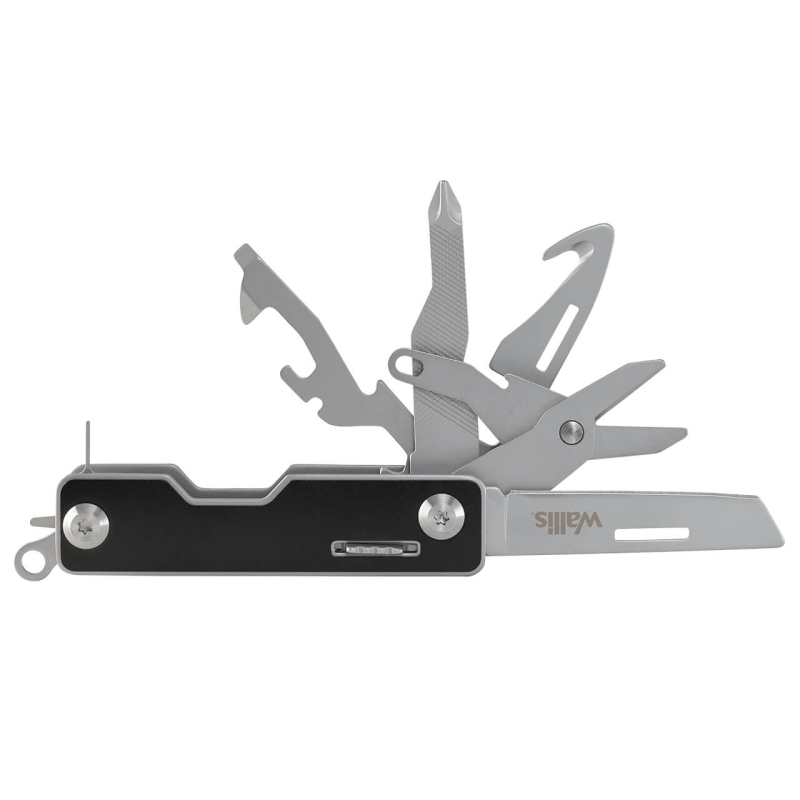 Multiherramienta Wallis fabricada en acero inoxidable con una dureza de 420, diseñada para afrontar cualquier reto con facilidad y precisión. El soporte para móvil te permite mantener tu dispositivo en posición horizontal, ideal para momentos de descanso o multitarea. Incluye también una llave de extracción para bandejas SIM, asegurando que estés preparado para cualquier situación técnica. Es la elección perfecta para aquellos que valoran la eficiencia y la calidad.