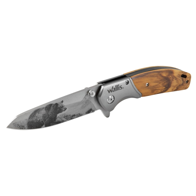 Navaja de bloqueo Wallis con hoja gris con ilustración de oso en ambos lados. El mango está hecho con madera de olivo. El bloqueo es manual con tornillo de apoyo. Ideal para actividades en el exterior, campismo, montañismo y outdoor. Cuenta con clip en el mango para que la lleves contigo de manera práctica.