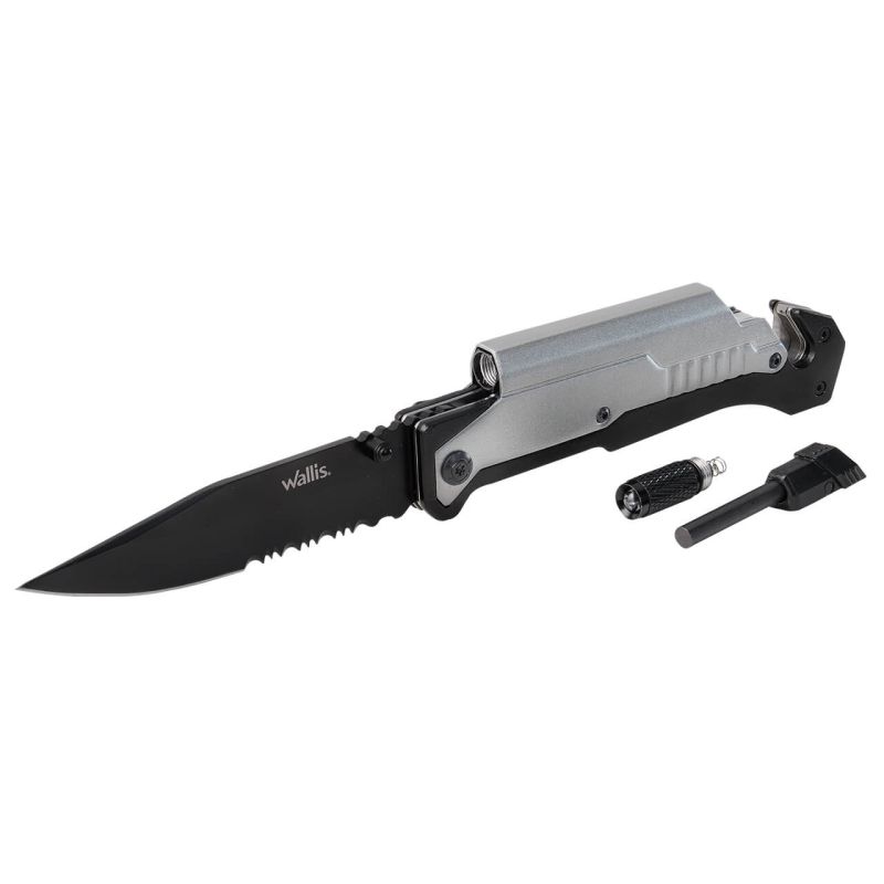 Navaja Wallis de bloqueo con hoja lisa con sierra mate negro. Mango de metal plateado con clip, para que la lleves cómodamente ya sea en la cintura o en tu vestimenta. Mango S.O.S., incluye bloqueo manual con tornillo de apoyo. Ideal para ser usado en situaciones de superviencia por sus características.